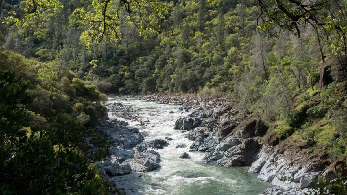 The trail starts with some up hill but is fairly flat after the that. The trail follows a branch of the South Yuba River and is cut into the hillside a hundred feet or above the river. Views up and down the river valley can be spectacular, especially in early morning and late evening light. In full sun, the water often looks turquoise, especially in slow moving bends where sandy bottoms reflect lots of light. Heavy snow melt makes for a dramatic flow of water over the large granite rocks.